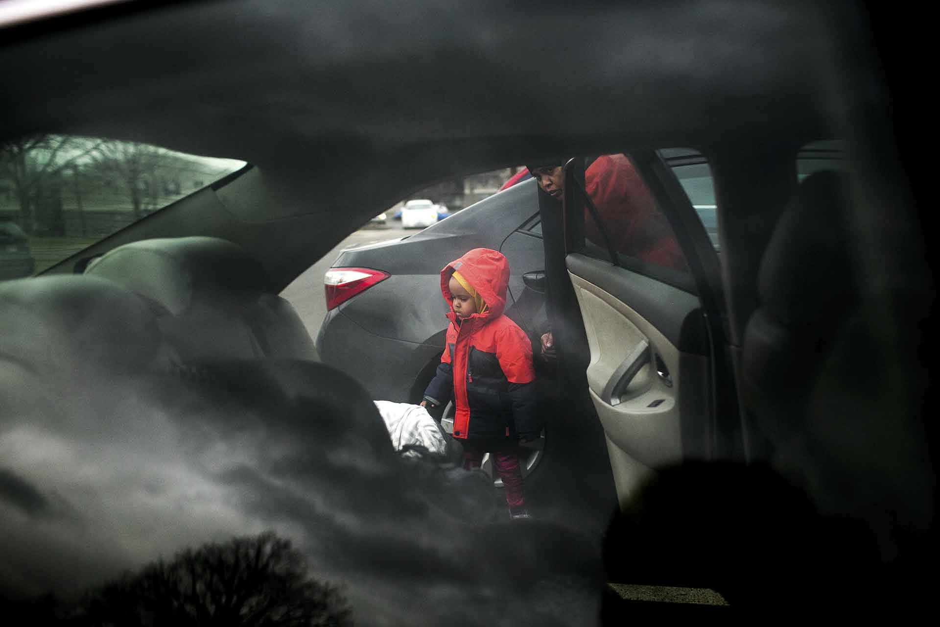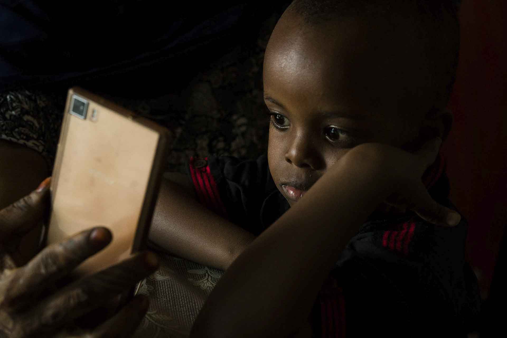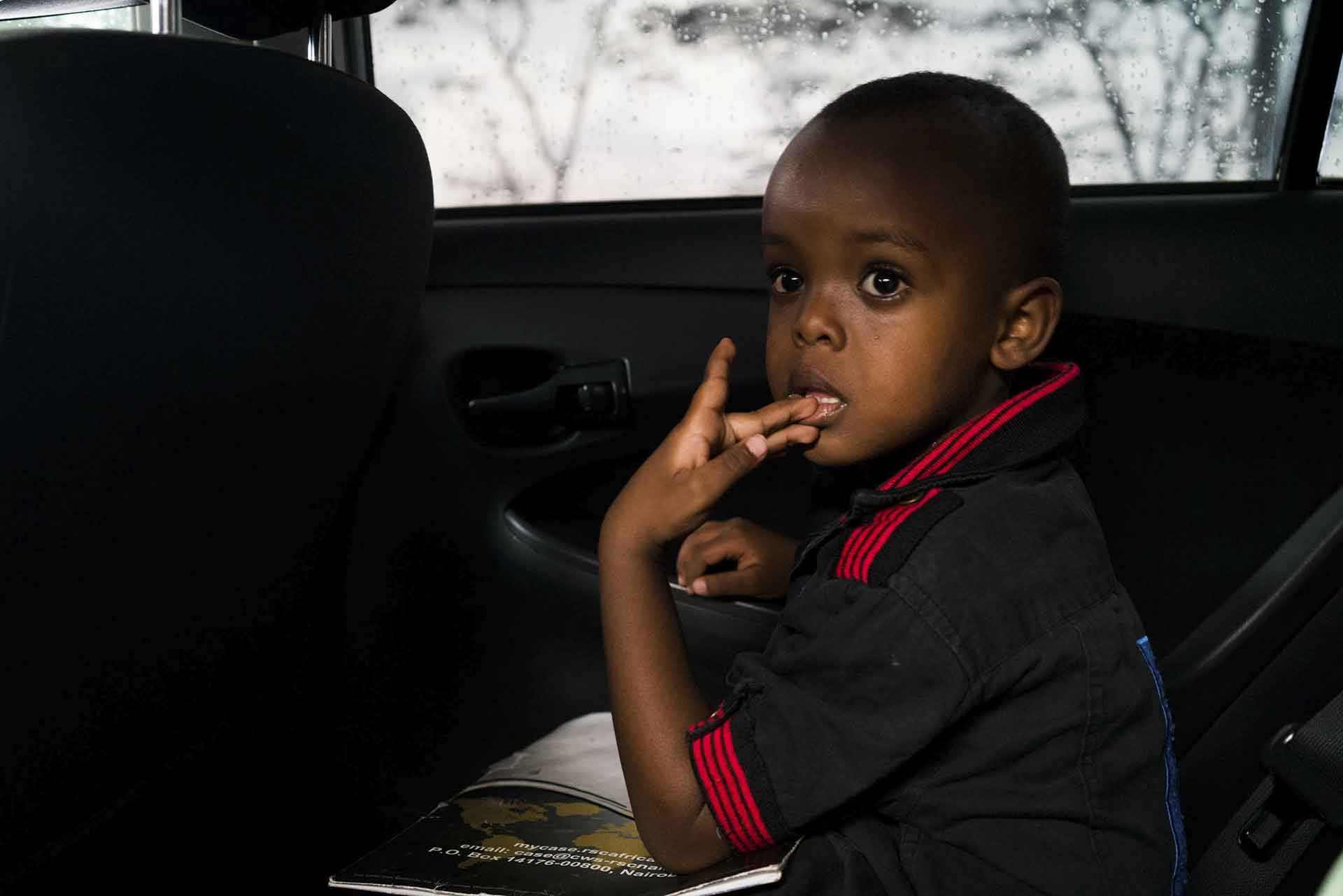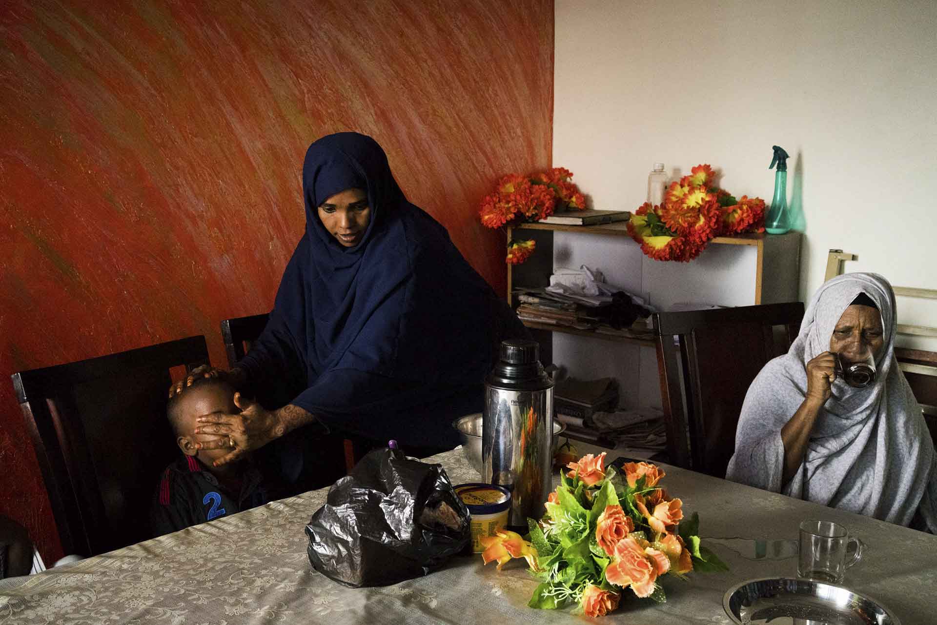 Kaltumo’s brother arrives to drive them to Mohamed’s appointment at the Department of Refugee Affairs in Nairobi’s Shauri Moyo neighborhood. In anticipation of a long wait, they take some bread and tea before they go. Kaltumo washes Mohamed’s face and wipes his nose.