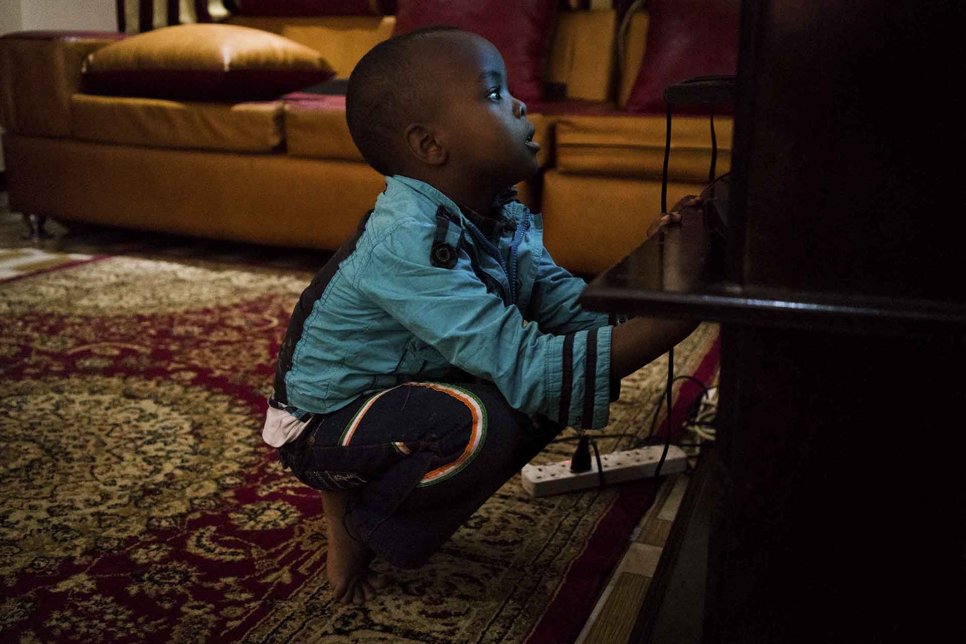 Mohamed sits in front of the TV as Bilal bounces around him, occasionally managing to get Mohamed to wrestle and chase him. After a breakfast of sweet black tea and white bread, Mohamed goes back to the TV. He sits six inches from the screen, transfixed. Today, he’s watching a British kids program in English, volume blaring twice as loud as it should be.
