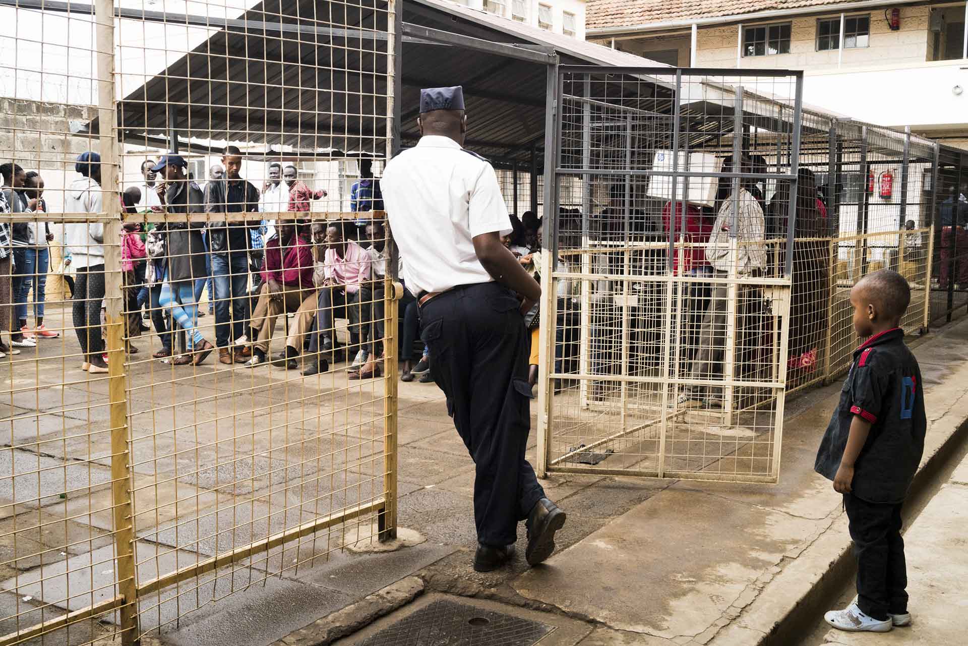 “I’m so frustrated by this,” Kaltumo says several hours in. “This is what I go through every time we come. If he was older, I would tell his mom to come and get her son.” But throughout the day she never raises her voice or gets frustrated with the staff. She keeps a close eye on Mohamed as he plays with a little girl, a new arrival, who is on the other side of the floor-to-ceiling fence. She laughs with a Somali couple who have waited all day for the past three days to be fingerprinted. One woman says that when they entered the building, the security guards said they could jump the queue for a $2 bribe.